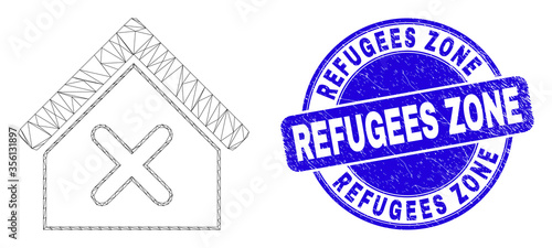 Web carcass closed house pictogram and Refugees Zone watermark. Blue vector rounded textured watermark with Refugees Zone phrase.