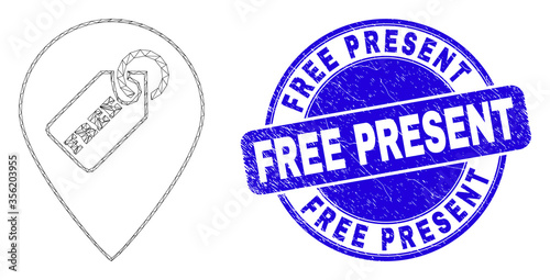 Web carcass free tag marker icon and Free Present seal stamp. Blue vector round grunge seal stamp with Free Present caption. Abstract frame mesh polygonal model created from free tag marker icon.