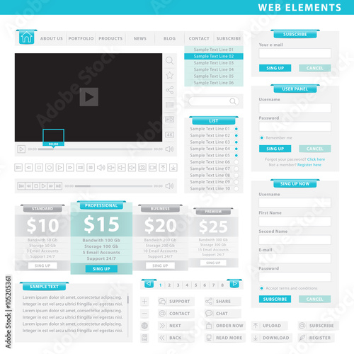 web, page, cyberspace, navigation, bar, banner, menu, list, player, icon, user, panel, filed, pledging, number, buttons, layout, element, slide, home, mail, motion picture, video, music, computer, technology, head, web design