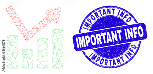 Web mesh graph chart icon and Important Info seal. Blue vector rounded grunge seal with Important Info text. Abstract frame mesh polygonal model created from graph chart icon.