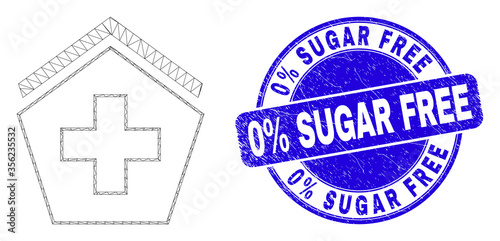 Web mesh hospital icon and 0% Sugar Free seal. Blue vector round distress seal with 0% Sugar Free phrase. Abstract frame mesh polygonal model created from hospital icon.