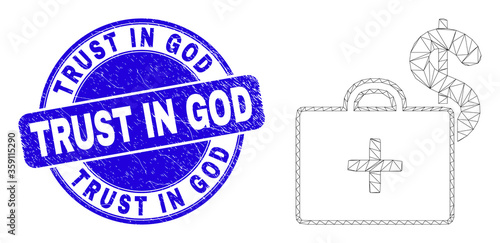 Web mesh medical business case pictogram and Trust in God seal. Blue vector round distress seal stamp with Trust in God text.