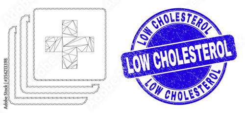 Web mesh medical data pictogram and Low Cholesterol seal stamp. Blue vector rounded grunge stamp with Low Cholesterol text. Abstract carcass mesh polygonal model created from medical data pictogram.