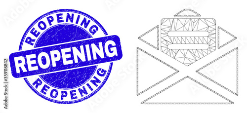 Web mesh open mail icon and Reopening seal stamp. Blue vector rounded distress seal with Reopening message. Abstract frame mesh polygonal model created from open mail icon.