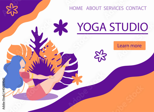 Website banner design for Yoga studio promotion with Learn more button. Yogi woman meditating