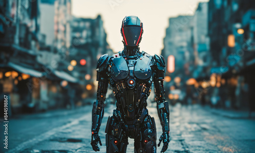 Website Banner, Futuristic Robot with Sleek Design and Red Eyes in Urban Setting, AI, Robotics, Technology, Cyberpunk