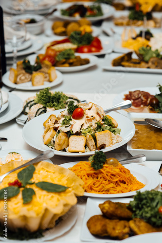 Wedding. Banquet. The table for guests. Appetizers and salads on the banquet table. Cold appetizers and salads on the wedding table.