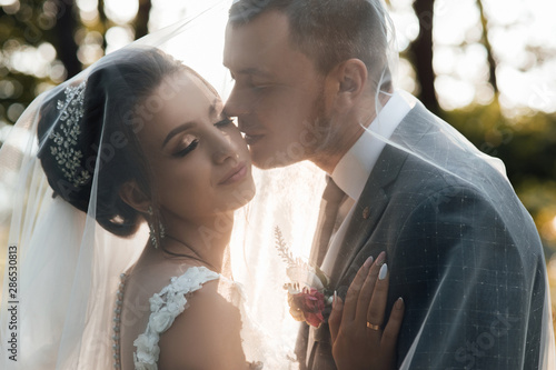 Wedding couple kisses under the veil. The Kiss. Close up portrait of sexy stylish wedding couple kissing under white veil. Portrait of lovers. The couple fully enjoys the moment. Black and white