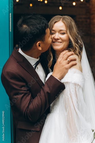 Wedding day. Beautiful European bride and her Asian groom posing against the backdrop of cafes and large windows.