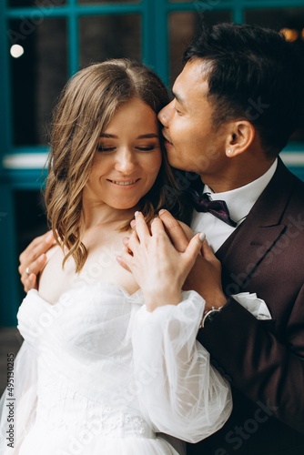 Wedding day. Beautiful European bride and her Asian groom posing against the backdrop of cafes and large windows.