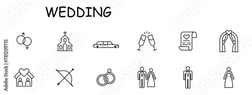 Wedding icon set. Document, wine, sex, glasses, church, heart, wife, wedding dress and suit, man, groom, house, limousine, bow, marriage certificate, altar. Marriage concept. Vector line icon.