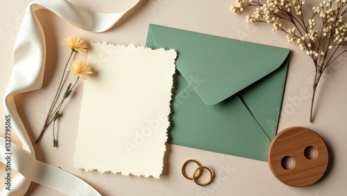 wedding, invite, card, stationery, paper, table, note, greeting, envelope, green, white, background, blank, pastel, leaf, ribbon, desk, letter, beige, flower, design, fashion, frame, vintage, concept, beauty, retro, template, invitation, lifestyle, topview, modern, silk, tree branch, feminine, composition, minimal, empty, scandinavian, nordic, rustic, arrangement, blog, display, elegant, ring