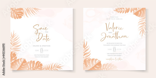 invite, save, greenery, invitation, postcard, date, anniversary, palm, watercolor, wedding, romantic, artistic, border, greeting, graphic, gold, elegant, exotic, frame, bouquet, chaplet, delicate, illustration, tropical, set, template, vintage, white, art, abstract