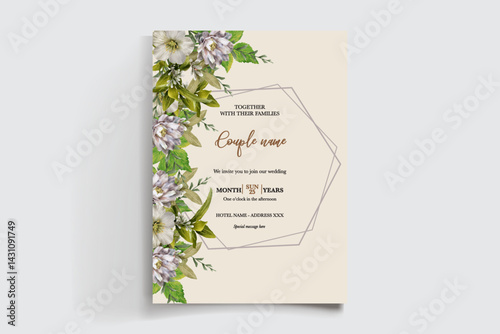 WEDDING INVITATION FRAME WITH FLOWER DECORATIONS AND FRESH LEAVES