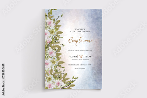WEDDING INVITATION FRAME WITH FLOWER DECORATIONS AND FRESH LEAVES