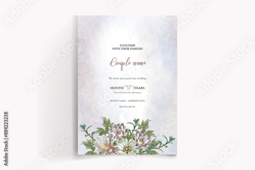 WEDDING INVITATION FRAME WITH FLOWER DECORATIONS AND FRESH LEAVES