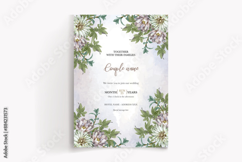 WEDDING INVITATION FRAME WITH FLOWER DECORATIONS AND FRESH LEAVES