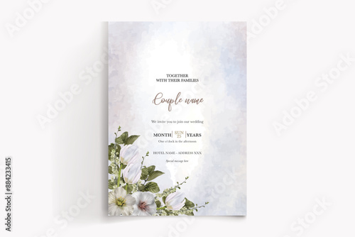 WEDDING INVITATION FRAME WITH FLOWER DECORATIONS AND FRESH LEAVES
