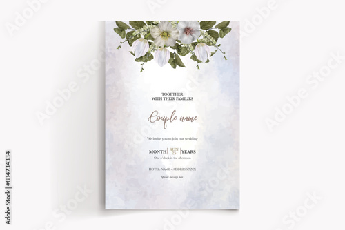 WEDDING INVITATION FRAME WITH FLOWER DECORATIONS AND FRESH LEAVES