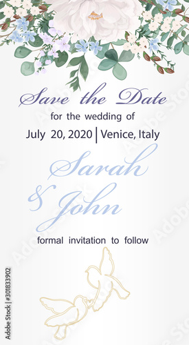 Wedding invitation with flowers Peony and Roses, watercolor, isolated on white. Vector Watercolour.