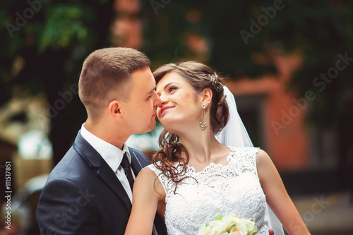 Wedding photo shooting. Bride and bridegroom walking in the city. Married couple embracing and looking at each other. Holding bouquet. Outdoor, full body