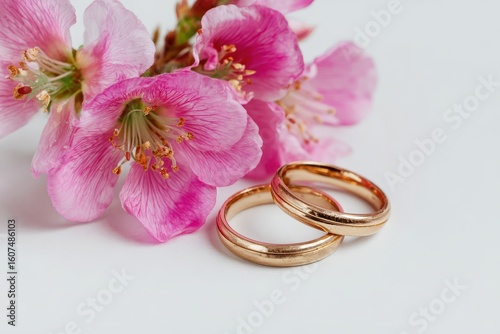 ring, wedding, gold, gold, blossom, pink, flower, floral, bloom, flower petals, marriage, love, ceremony, engagement, band, jewellery, celebration, romantic, romance, spring, white, background, couple, together, forever, promise, commitment, nuptials, bridal, bride, groom, married, anniversary, elegant, delicate, detail, closeup, macro, beautiful, fresh, nature, plant, flora, season, springtime, flowering, wedding band, wedding day
