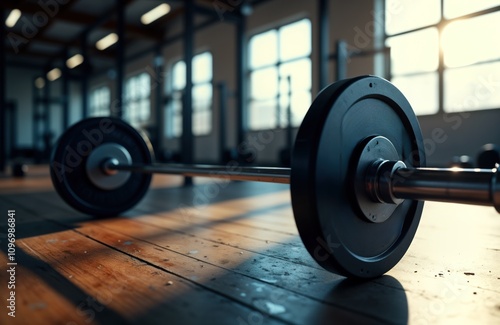 Weightlifting barbell rests on gym floor. Sunlight streams through windows. Fitness equipment. Workout. Bodybuilding. Strength training. Gym interior. Exercise. Healthy lifestyle. Sport. Barbell