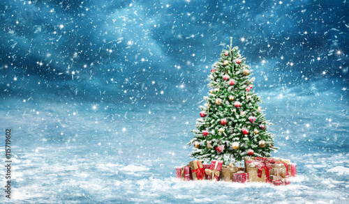 christmas tree, snowscape, snowy, christmas tree, ornament, decoration, gift, snow, snowfall, heaven, cloud, snowflake, trickle, fall, christmas, ball, gift wrap, sharpen, decorated, bejeweled, colourful, red, gold, outside, packet, wrapped, view, appearance, icicle, enchanted, blue, white, frost, ice, holiday, christmas eve, fun, anticipation, wish, vacation, recreation, neckline