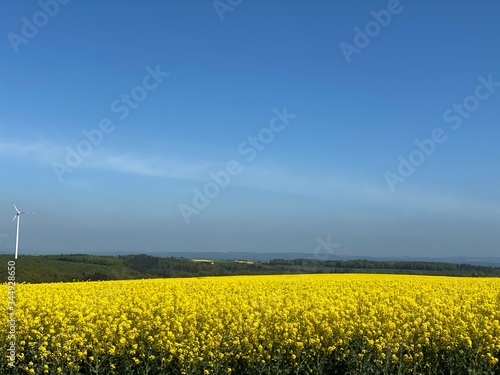 Weite Sicht über Rapsfelder (Windrad) über die Eifel bis in den Hunsrück bei Cochem - Feldweg - Raps - Öl - Baum - Natur - Landwirtschaft
