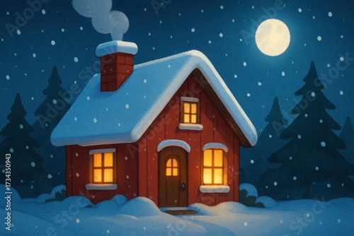 Welcome happy Christmas home. Cozy snow-covered cabin under a full moon with falling snowflakes and surrounding pine trees.