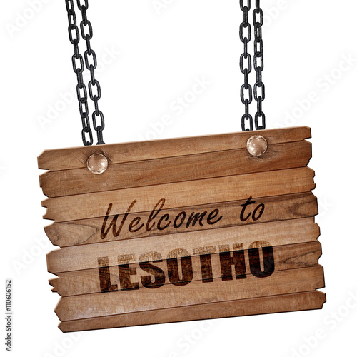 Welcome to lesotho, 3D rendering, wooden board on a grunge chain