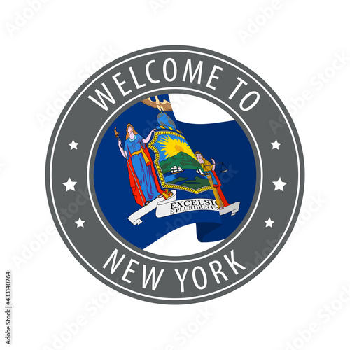 Welcome to New York. Gray stamp with a waving state flag.