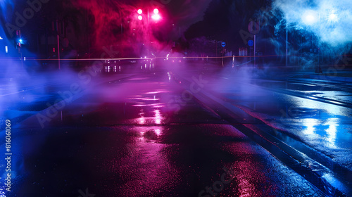 Wet asphalt reflection of neon lights a searchlight smoke Abstract light in a dark empty street with smoke smog Dark background scene of empty street night view night city : Generative AI