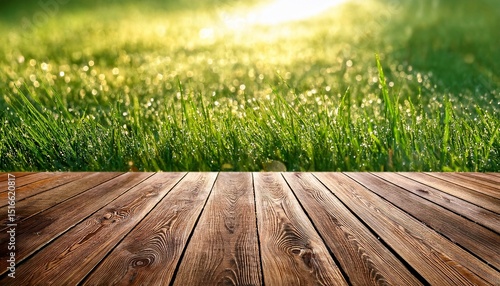 wet wooden planks reflect sunlight after rain green grass blurred background