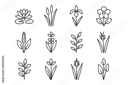 wetland, wildflower, icon, outline, icon, set, wildflower, water, lily, cattail, iris, marsh, marigold, arrowhead, flower, sedge, water lily