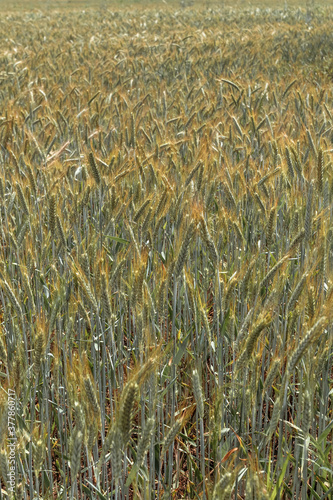 Wheat field. The ears of wheat. Large wheat field against blue sky and village. European field. Landscape of countryside and farm. Vertical photo.