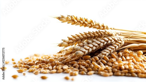 Wheat grains and golden stalks are arranged artistically on a light background, highlighting the beauty of agricultural produce and the essence of harvest time