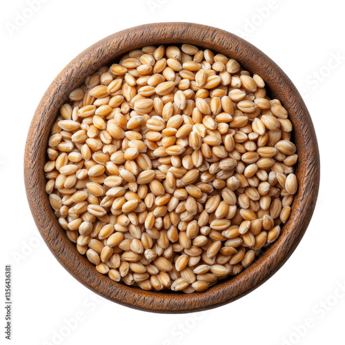 Wheat grains in a wooden bowl on a transparent background. Top view. Healthy food concept.