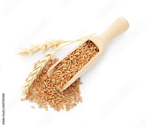 Wheat grains in wooden scoop and spikelets isolated on white, top view