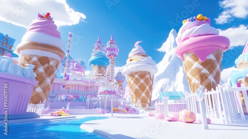 whimsical, three-dimensional, ice, cream, wonderland, animated, treat, giant, scoop, candy, colourful, vibrant, fun, sweet, dessert, earth, fantasy, playful, imaginative, childlike, delicious, dreamy, magical, environment