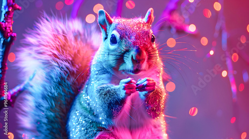 squirrel, animal, creative, concept, disco, neon, glistering, glam, shiny, glow, spangled, outfit, copy, text, space, vibrant, colourful, whimsical, surreal, fantasy, nature, wildlife, rodent, sparkle, shimmer, illumination, radiance, luminance, iridescent, captivating, eye-catching, unique, contemporary, stylised, imaginative, experimental, abstract, decorative, glamourous, dazzling, glitzy, opulent, fabulous, enchanting, mesmerizing, magical, aethereal, dreamlike, fanciful