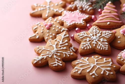 whimsical arrangement of gingerbread cookies on soft pastel pink background intricate icing details festive shapes warm cinnamon tones inviting negative space