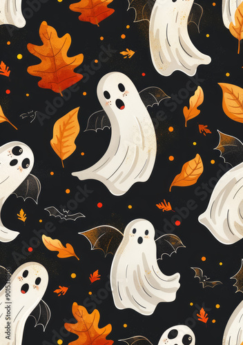 Whimsical autumn pattern with ghosts, bats and falling leaves for Halloween celebration.