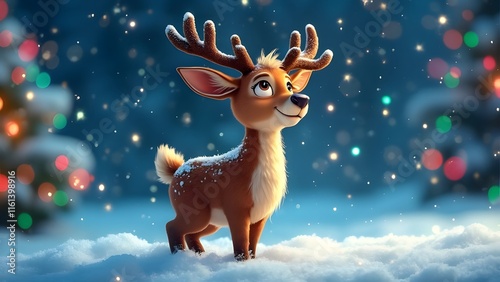 Whimsical Cartoon Reindeer in Snowy Winter Wonderland with Festive Lights, Christmas Holiday Illustration