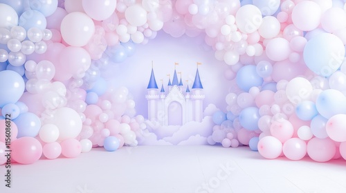 Whimsical castle with pastel balloons in dreamy celebration backdrop