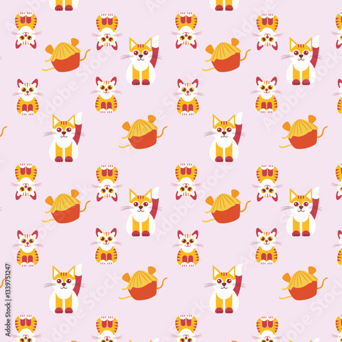 Whimsical Cat and Yarn Ball Pattern on Light Pink Background