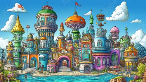 city, coastal, whimsical, fantasy, architecture, design, building, tower, colourful, vibrant, illustration, art, digital, painting, landscape, seascape, water, ocean, sky, cloud, castle, town, village, house, dome, church steeple, flag, detail, intricate, ornate, playful, cartoon, style, bright, cheerful, joyful, magical, dreamlike, fairy tale, harbor, shore, unique, quirky