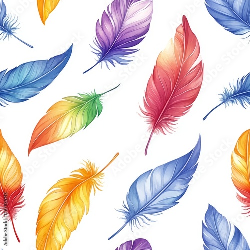 Whimsical colorful feathers arranged in a seamless pattern against a white backdrop.