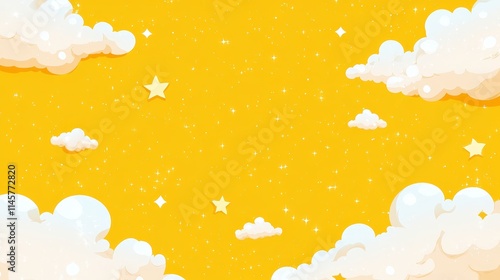 Whimsical comic book background featuring fluffy clouds and twinkling stars floating on a vibrant yellow backdrop.