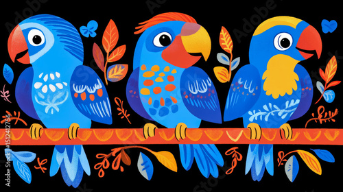 Whimsical concept, print for kid: Three Colorful Parrot Friends on a Branch